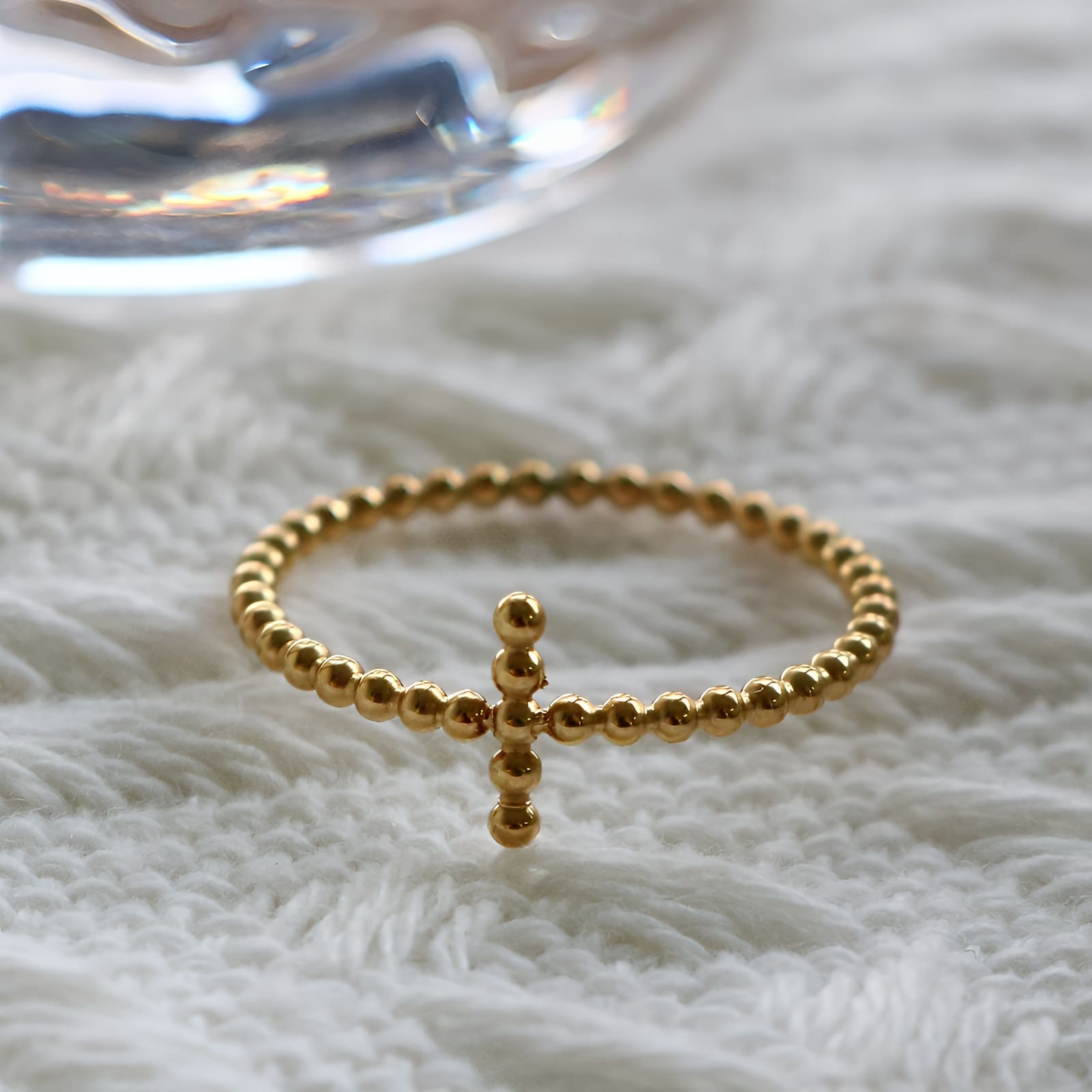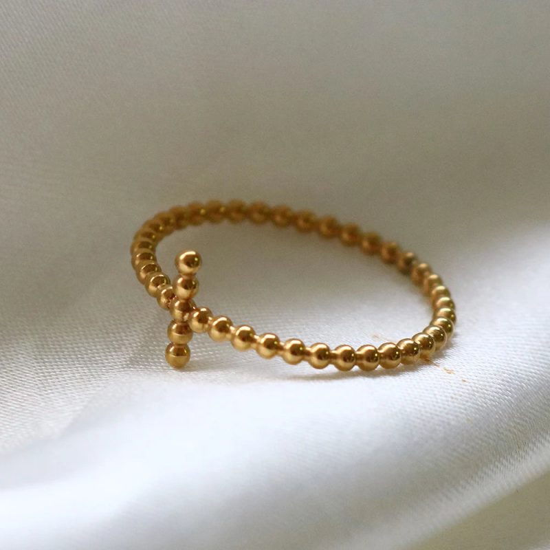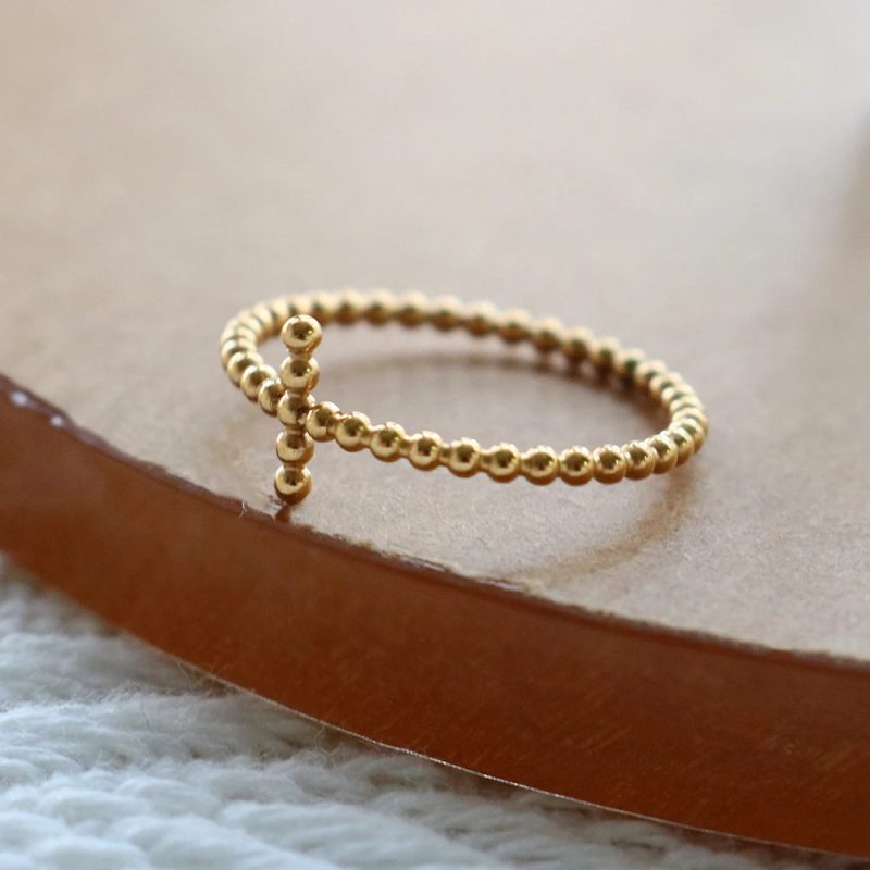 L’acier inoxydable garantit une résistance aux gestes répétés du quotidien. Les perles dorées conservent leur brillance malgré les frottements, les lavages de mains, les contacts avec les matières. Cette bague se porte seule ou s’accumule avec d’autres anneaux fins, créant une composition personnelle où la croix demeure visible.