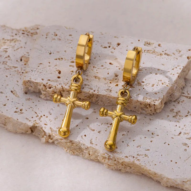 Ces boucles créoles croix dorées traversent les registres stylistiques avec aisance. Sur un pull sobre, elles deviennent l’accent qui structure l’ensemble. Associées à une tenue rock, elles renforcent l’attitude sans surcharge visuelle.