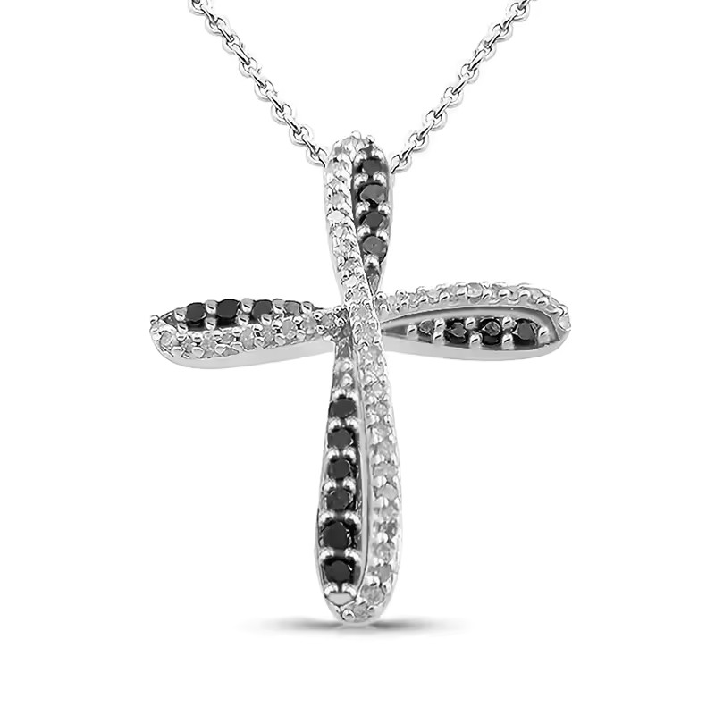 Ce pendentif croix argenté dessine une géométrie contrastée où cristaux noirs et blancs dialoguent le long de branches courbes. L’acier inoxydable poli structure un symbole aux proportions élancées, tandis que les incrustations bicolores créent un jeu graphique entre ombre et lumière.